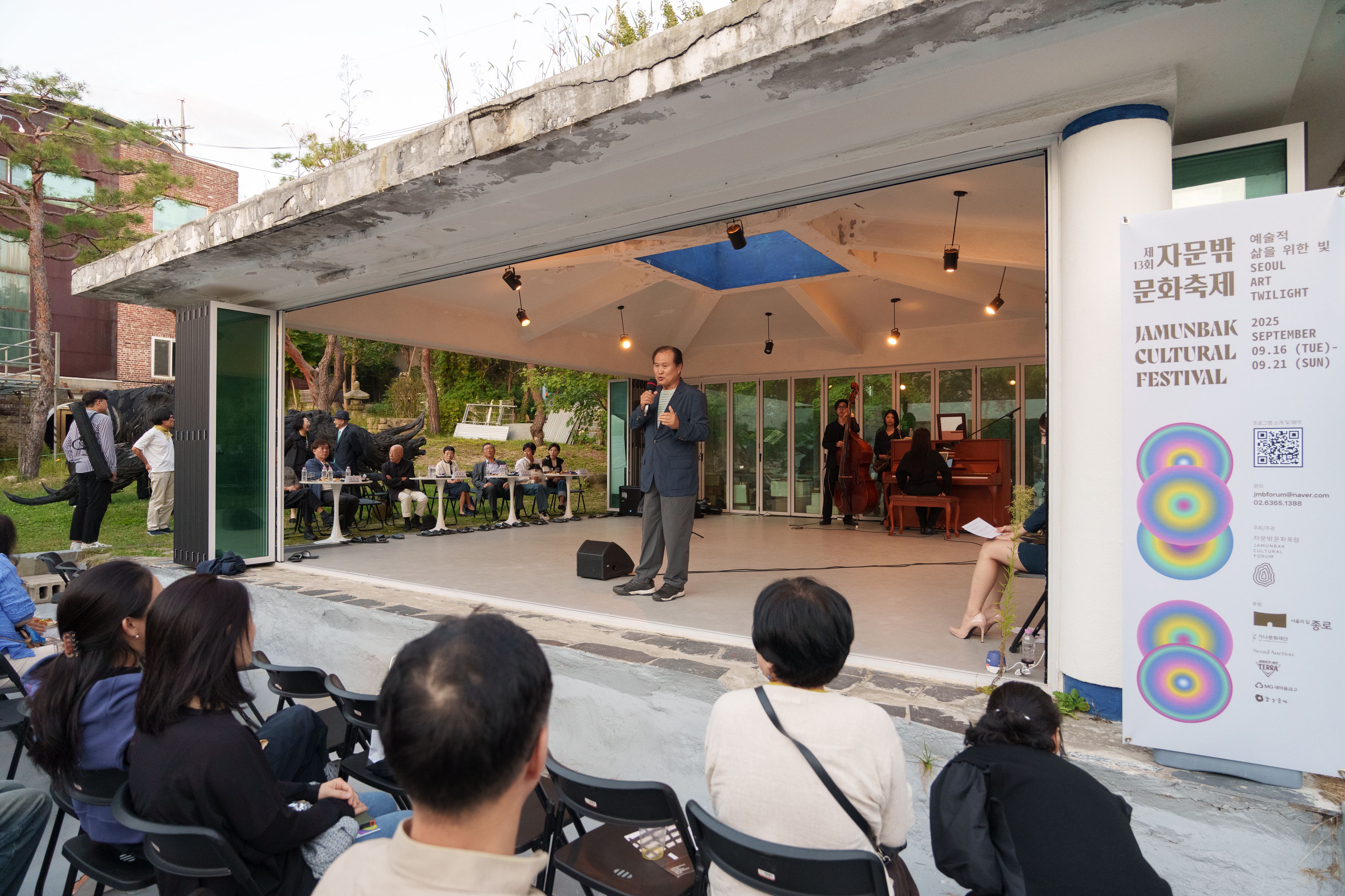 9월 21일 일요일 저녁, 자문밖 아트레지던시 팔각정에서 제13회 자문밖문화축제의 마지막 무대인 폐막잔치가 열렸습니다. 폐막잔치는 “당신이 본 것과 보지 못한 것, 그러나 우리가 함께 볼 수 있는 것들에 대해”라는 부제를 통해 서로 다른 시선과 감각이 만나는 장을 만들고자 했습니다. 이순종 이사장의 인사말과 김종규 고문의 축사, 김개천 총감독의 인사말이 이어지며, 지난 축제를 돌아보고 마지막 순간을 함께 준비하는 마음을 나눴습니다. |