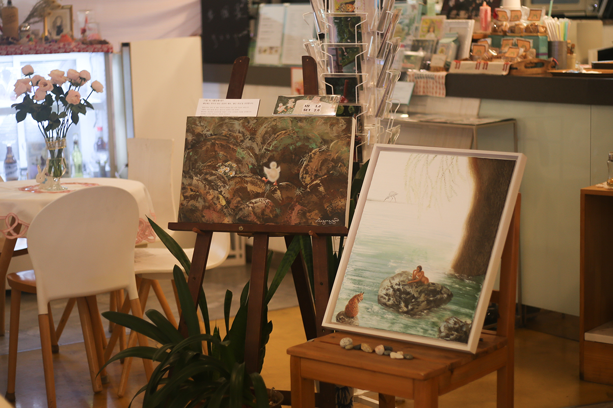운영하며 가장 어려웠던 점은 무엇이었나요? 이강유 작가: 초반에는 아무것도 몰랐어요. 아르바이트라도 해보고 시작했으면 좋았을 텐데, 하는 아쉬움이 컸죠. 그런 시행착오를 거치며 배운게 많아요. 그 과정에서 금전적으로도 책임지는 대표님의 어려움도 있었을 거 같고요. 강선영 대표: 그래도 우리는 이 공간의 가치가 단순한 임대료 이상의 의미를 지닌다고 믿었어요. 예술가로서 현실 속에서 부딪히는 실존적인 문제라고 생각해요. 이강유 작가: 맞아요. 예술가의 현실을 그대로 보여주는 공간이기도 해요. 손님들이 ‘그림도 그리세요?’라고 묻기도 해요. 이 공간을 대하는 다양한 손님들의 반응도 의미 있다고 생각해요. |