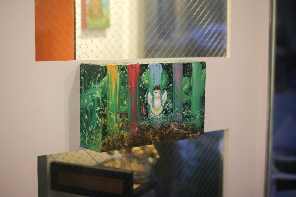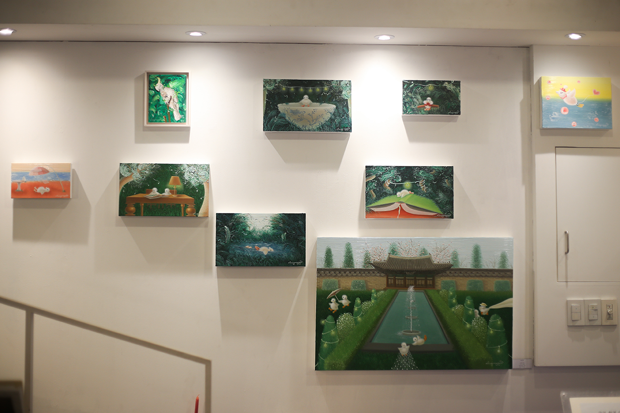 현재 전시 중인 이강유 작가님의 작품들은 어떤 주제와 과정을 담고 있나요? 이강유 작가: 초창기에는 자연과 인간의 관계에 관심이 많았어요. 2022년부터는 초록색을 중심으로 한 자연 그림을 그리기 시작했죠. 열린 공간을 운영하다보니 우연히 일어나는 일들에 관심이 가기 시작했어요. 누군가를 떠올렸는데 마침 그 사람이 찾아오는 것처럼, 보이지 않는 인연의 흐름이 있다고 느꼈어요. 그런 ‘보이지 않는 연결’을 자연의 이미지로 표현하고 싶었습니다. 그림은 유화로 작업하는데, 물감이 마르기 전에 서로 엮이는 터치들을 더해 전도체처럼 연결되는 느낌을 줍니다. 인간은 인위적인 존재이지만, 선한 마음으로 살아간다면 자연과의 조화 속에서 번성할 수 있다고 믿어요. 최근에는 ‘웨딩새(Wedding Bird)’라는 캐릭터를 만들었는데, 결혼이 지닌 '좋은 만남'이라는 의미를 세계관에 상징적으로 담은 존재예요. |