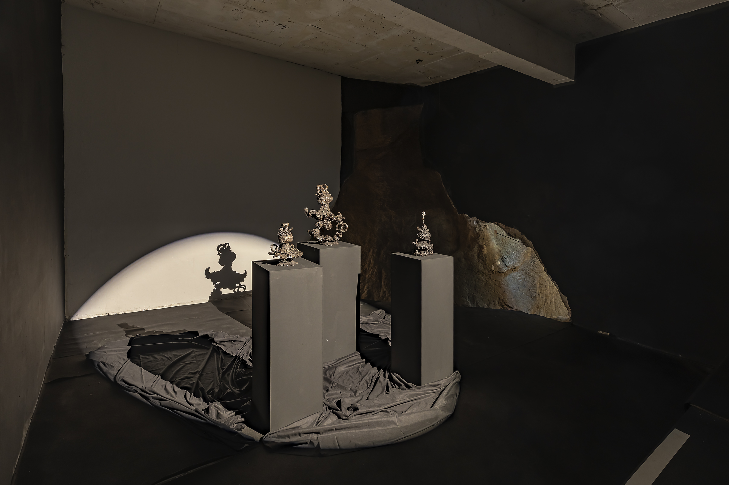 토탈미술관은 구조적으로도 특징이 분명한 공간이에요. 입구와 출구가 같고, 관람 동선이 위에서 아래로 내려가는 방식입니다. 본 전시장은 가장 아래층, 즉 지하에 위치하고 있고 그 위에 메자닌(중층)이 존재해요. 또 자연 암반이 그대로 드러난 공간도 있어서, 전형적인 화이트 큐브와는 다른 감각을 제공합니다. 작가 역시 이런 공간성을 어느 정도 염두에 두고 작업을 준비한 부분이 있었기 때문에, 저희가 가장 많이 고민한 건 “이 공간에서 작가의 작업을 어떻게 보여줄 것인가”, 그리고 “작가가 지금까지 해온 프리젠테이션 방식과 무엇을 달리할 것인가”였어요. 미술관에서 전시를 다룰 때는 결국 무엇을 어떻게 다르게 보여줄지를 계속 질문하게 되는데, 이번에는 공간이 다층적이다 보니 그 고민이 더욱 크게 작동했습니다. 그 과정에서 기획안에 어떤 요소를 넣을지, 동선에서 무엇을 강조할지, 그리고 DP를 포함해 전시가 ‘보여지는 방식 전체’를 새로 설계해야 한다는 판단에 이르게 됐고요.