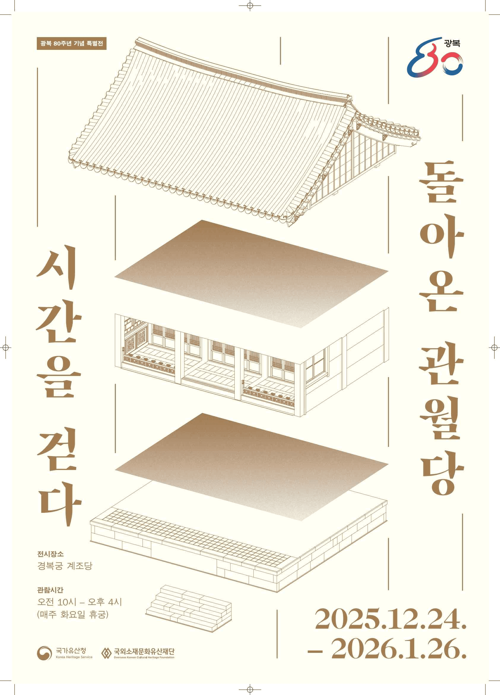 국가유산청(청장 허민)은 국외소재문화유산재단(사무총장 곽창용)과 함께 광복 80주년을 맞아 12월 24일부터 2026년 1월 26일까지 경복궁 계조당(서울 종로구)에서 일제강점기 일본으로 반출되었다가 약 100년 만에 국내로 반환된 조선시대 건축물 ‘관월당(観月堂)’의 여정을 조명하는 특별전 「돌아온 관월당: 시간을 걷다」를 개최한다.