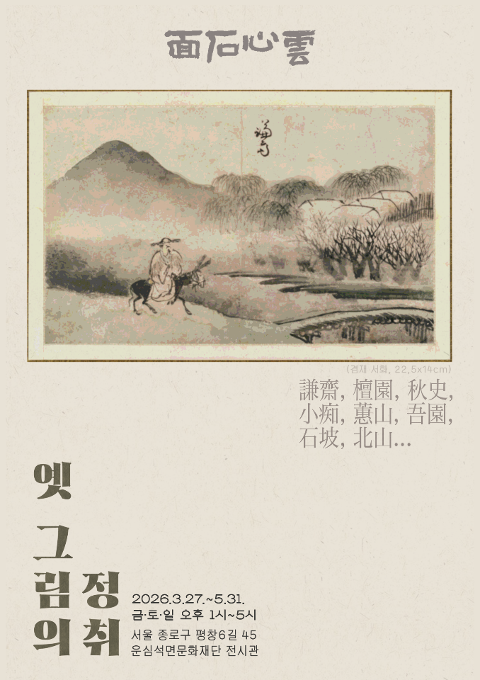오래 기다리셨습니다. 운심석면문화재단 설립자 김용원 선생이 가장 아껴온 조선화를 걸었습니다. 겸재, 단원, 추사, 소치, 혜산, 오원, 석파, 북산의 품격을 새봄 새 기운 속에 감상하시기 바랍니다.