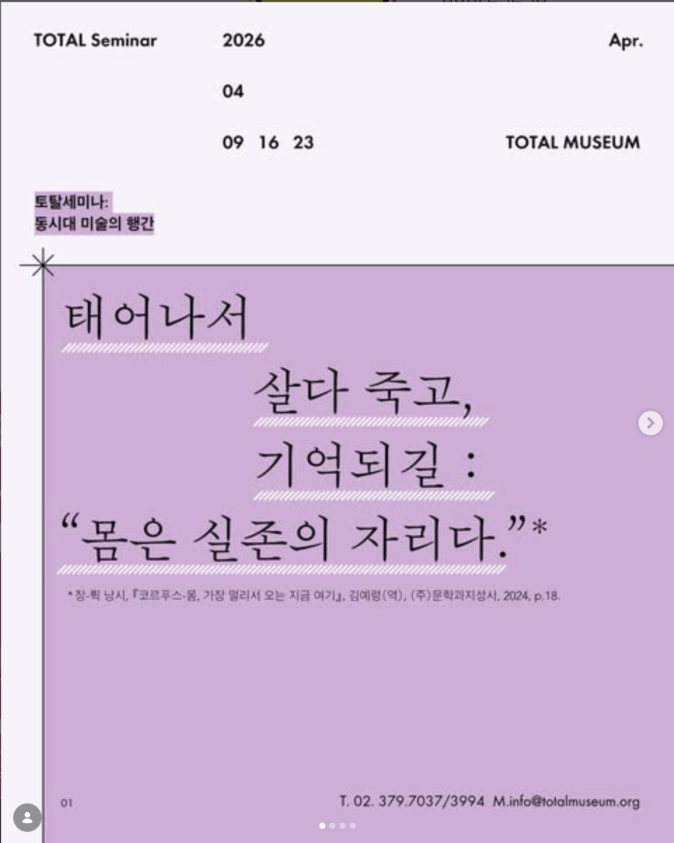 1993년부터 〈토탈아카데미〉를 운영해 온 토탈미술관은 30년이 넘는 시간 동안 예술 교육의 장을 지속적으로 확장하며 동시대 문화예술 담론을 축적해 왔습니다. 이러한 축적된 경험과 연구 기반을 토대로 시작된 〈토탈세미나〉는 동시대 미술을 보다 깊이 있게 읽어내기 위한 연구형 프로그램입니다.
