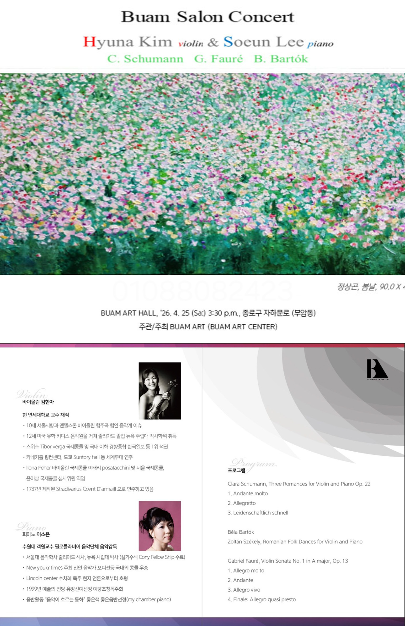 오는 4월 25일, 부암아트홀에서 Buam Salon Concert가 열립니다. 바이올리니스트 김현아와 피아니스트 이소은이 함께하는 듀오 무대에 큰 관심 부탁드립니다.